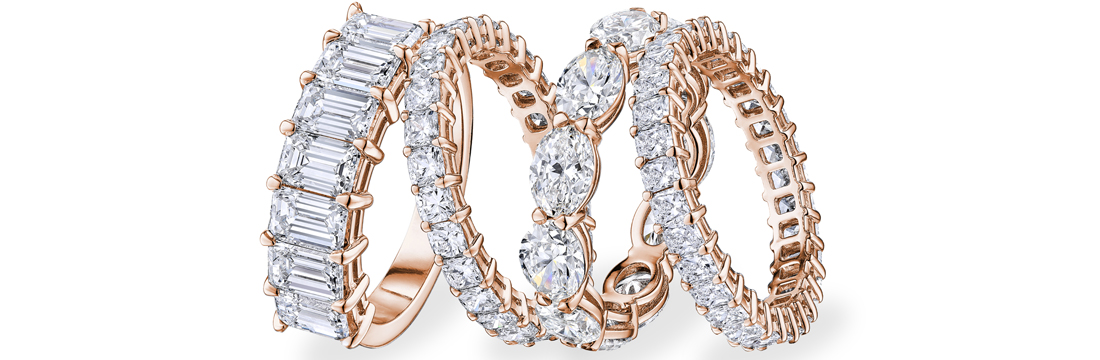 Diamond eternity bands are some of our best-selling wedding rings, due to their brilliance and versatility. They can be worn alone or paired with a channel-set or classic engagement ring. The two most popular styles are channel setting, where diamonds are set side-by-side, and a shared prong setting.